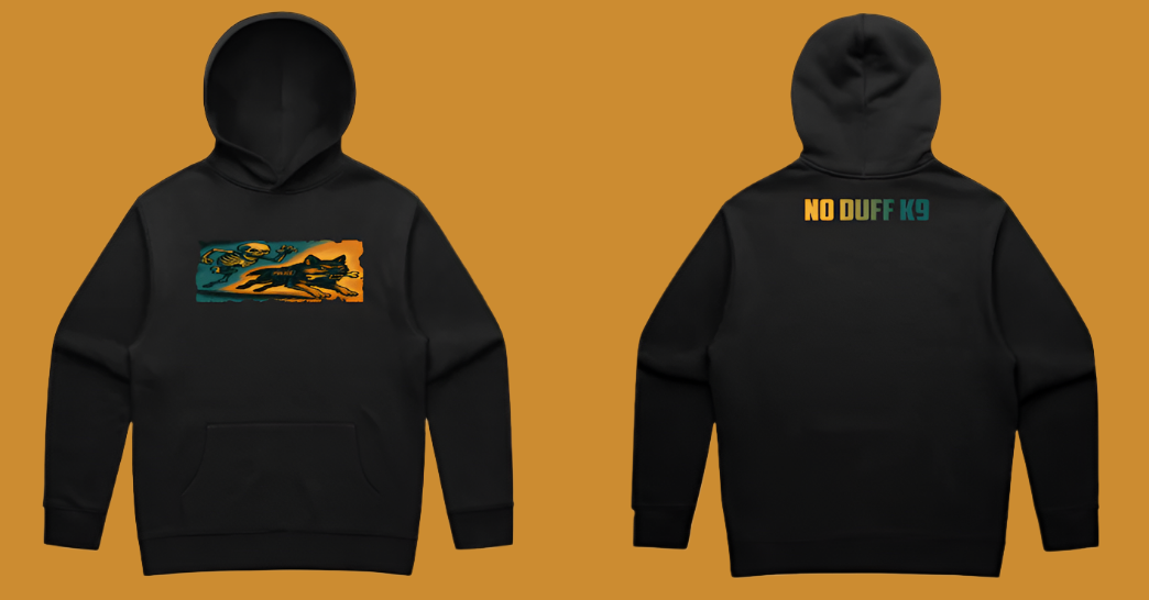 This isn’t just a shirt—it’s a warning. Featuring a snarling, no-nonsense K9 hauling ass with a bone between his teeth (guess who it belonged to?), this design is for those who don’t chase clout—they chase bad dudes. In true NO DUFF style, it’s bold, gritty, and a little twisted. Perfect for handlers, hitters, or anyone who thinks death should be afraid of the dog.